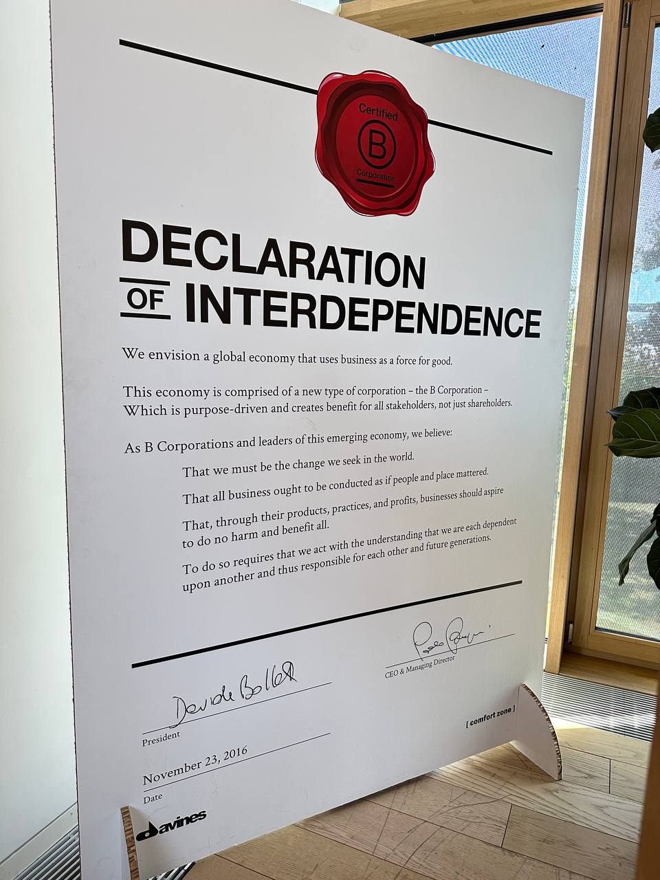 Такую позицию Davines Group подтверждает сертификат B Corp, который оценивает социальную и экологическую эффективность коммерческих компаний. В 2022 году Davines Group прошла ресертификацию, получив 117,4 балла из 200 возможных, доказав, что действительно положительно влияет на окружающую среду и людей, и придерживается sustainable бизнес-модели. Как отмечает Олеся Божко "среди миллионов компаний, которые производят косметические бренды, таких совсем немного!"
