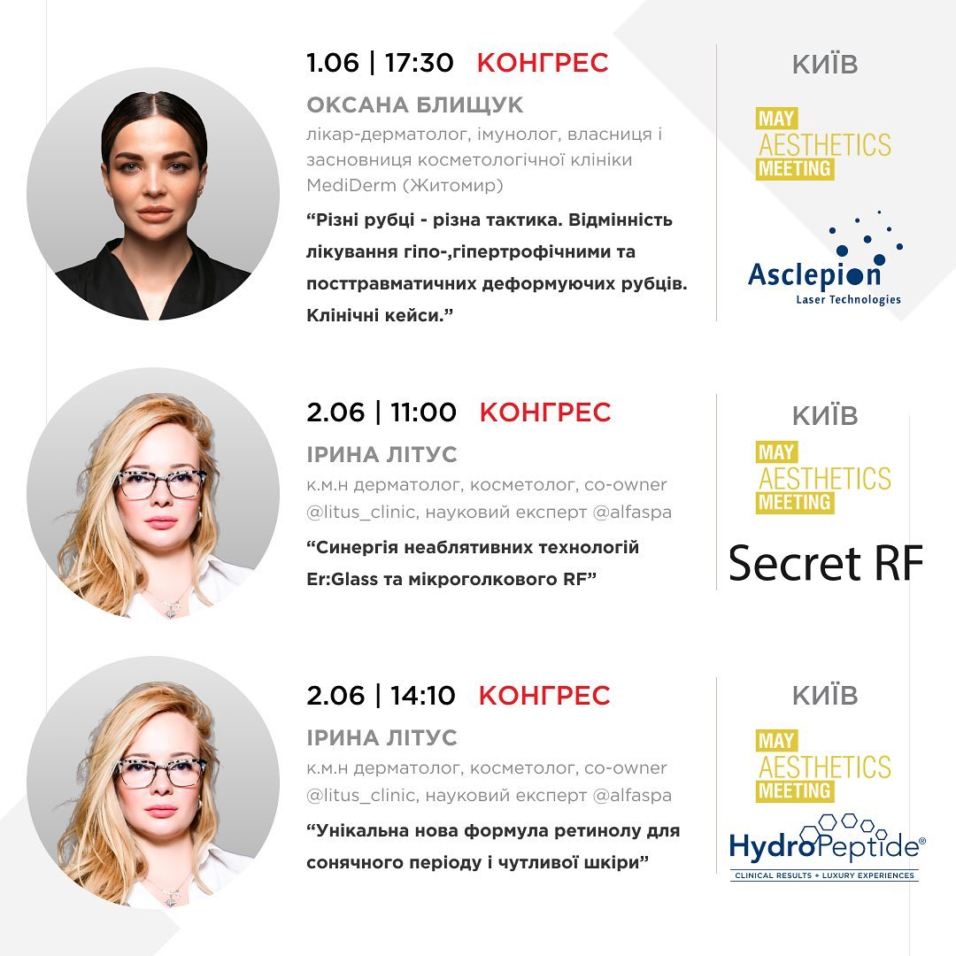 - May Aesthetics Meeting где презентуют доклады Оксана Блищук и Ирина Литус. Новые методики, бесценный опыт лучших экспертов, ждут вас!