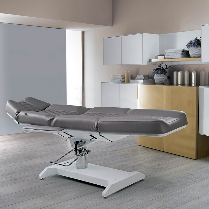 Место для клиента разделено на четыре секции: подголовник, спинку с подлокотниками, сиденье и подставку для ног. Вместе они составлены в единое целое — один матрас, который обеспечивает комфортное проведение процедуры и легко настраивается под клиента. Он может садиться на кушетку и вставать без каких-либо усилий.