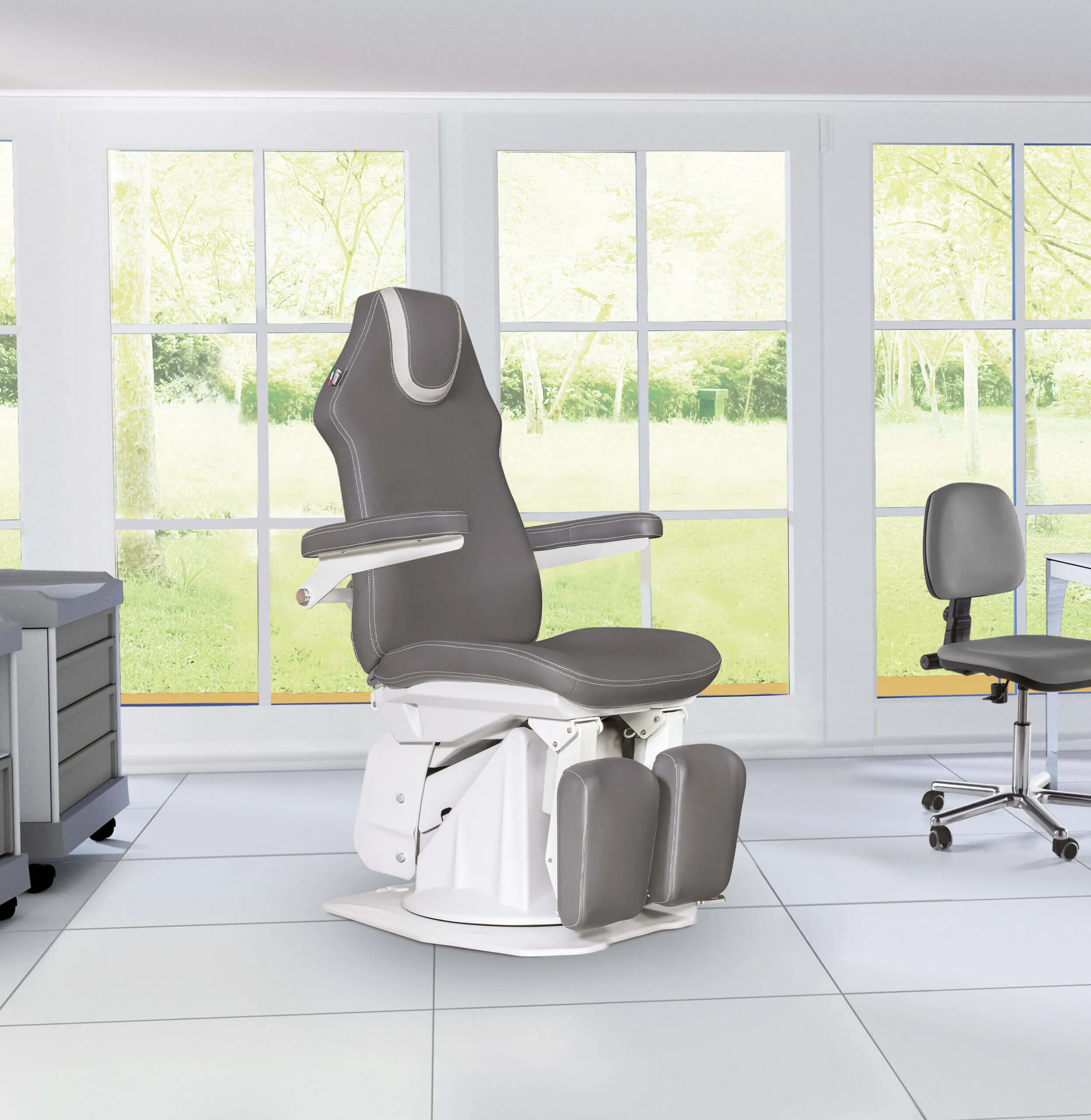 Кресло для подиатра входит в линейку мебели для медицинских учреждений от итальянской компании Lemi. Его конструкцию разрабатывали совместно с врачами и ведущими экспертами отрасли, поэтому оно удобно для широкого спектра процедур по здоровью и уходу за ногами. У него компактное основание, благодаря чему оно поместится даже в небольшом кабинете врача. С помощью педали его можно разворачивать на 180°.