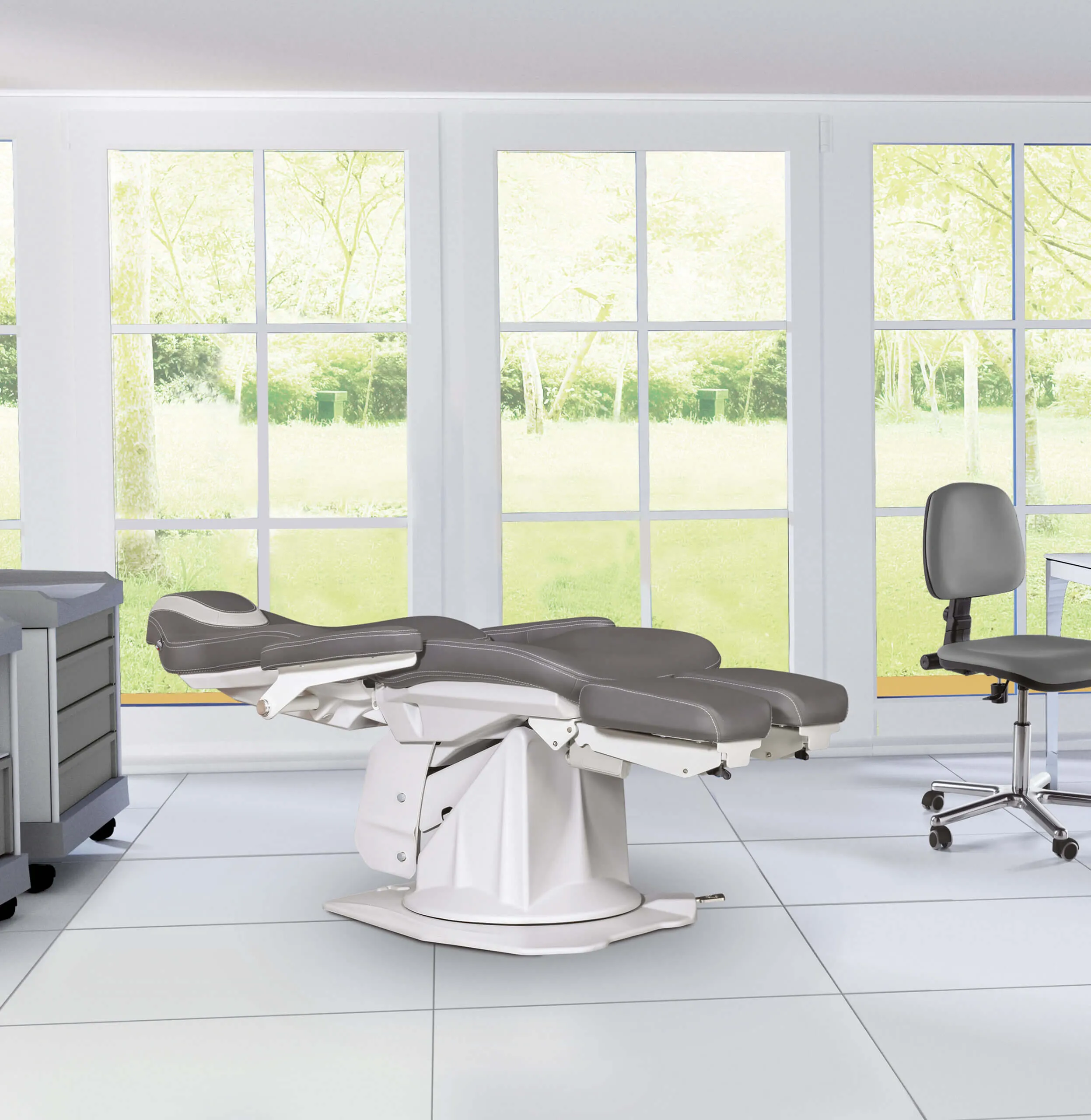 Внутри кресла установлены электродвигатели и электроника для управления разными секциями. Врач без труда сможет расположить пациента для процедуры, изменив высоту сиденья, наклон спинки и подставок для ног. Благодаря такой функциональности, во время процедуры врач может занять удобное положение на стуле и не менять его для совершения определенных манипуляций.