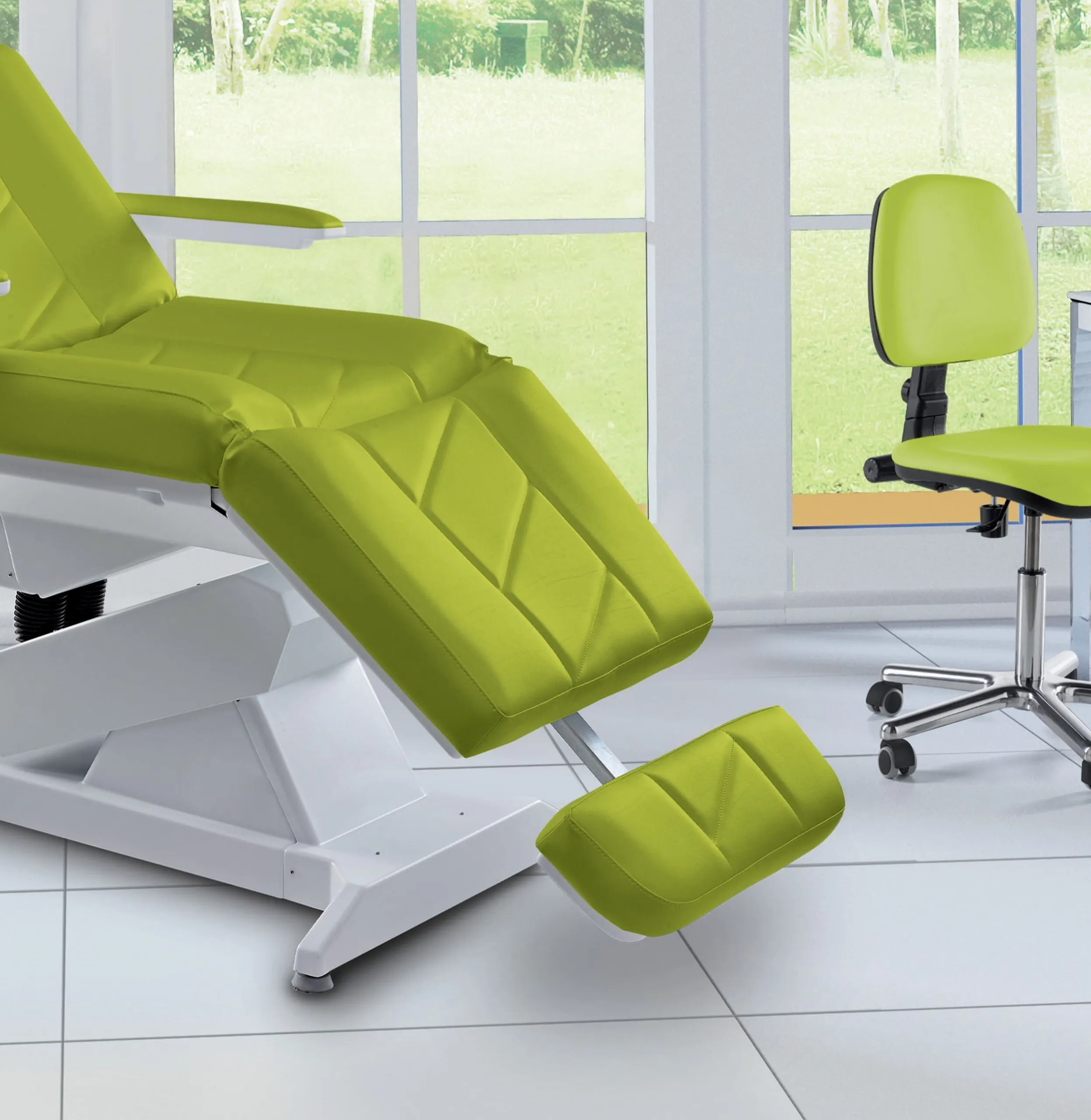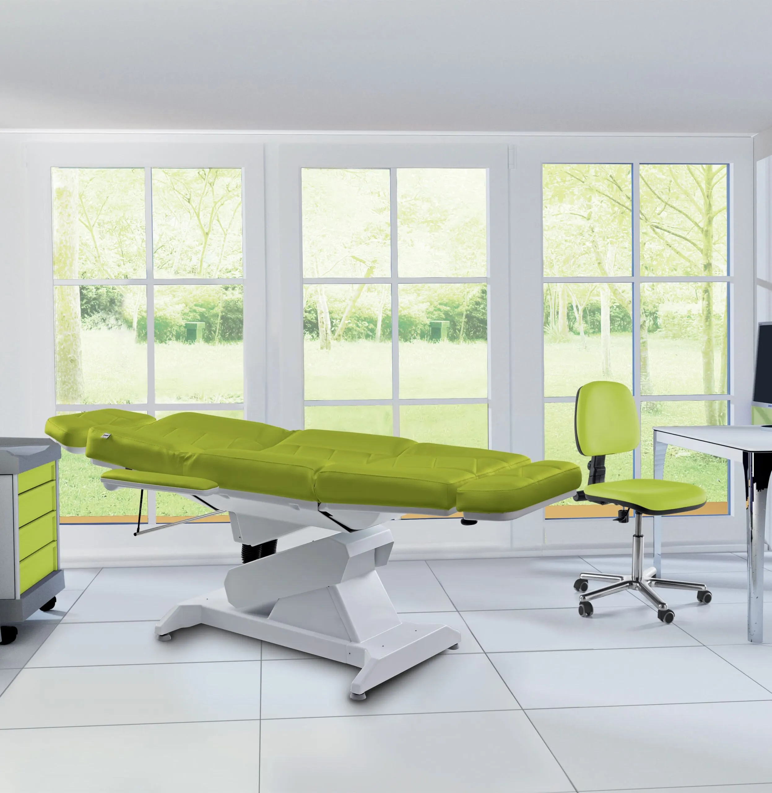 Кресло оснащено бесшовным матрасом Bi-Zak: он позволяет использовать практичные ручки для регулировки положения головы и ног, обеспечивая максимальный комфорт как для пациента, так и для врача.