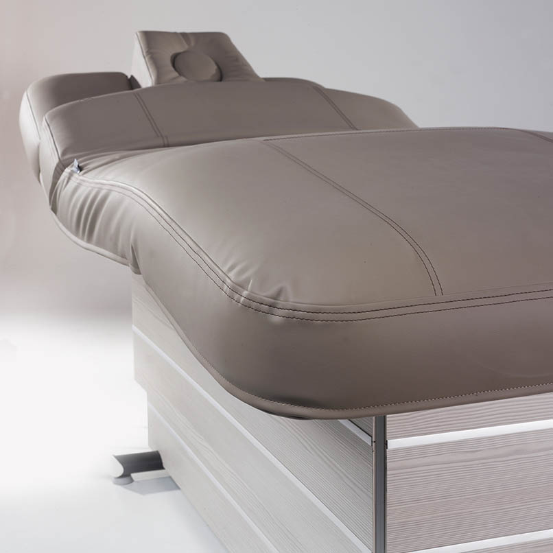 Кушетка для СПА Lemi Versus с мягким матрасом и съемной подушкой, закрывающей отверстие для лица в подголовнике. Они обшиты огнестойким, антибактериальным и противогрибковым покрытием без «Азо». Под матрасом основание с отделкой «под дерево», которое можно изменить. Доступные цвета матраса и основания премиальной кушетки можно посмотреть в самом низу карточки товара.