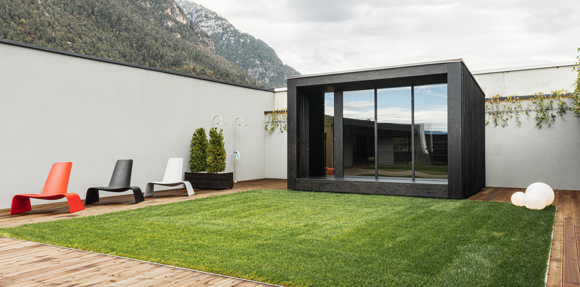 Будівля, людина та природа стають єдиним цілим завдяки використаним матеріалам, індивідуально відібраним з огляду на навколишній простір. Матова мідь для захисту деревини окислюється по-різному відповідно до клімату, а дерев’яне покриття, що піддається впливу атмосферних речовин, деколи приймає унікальні відтінки.
