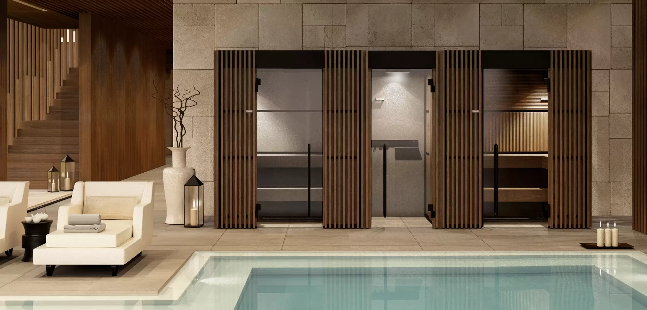 Приємні відчуття від водних процедур та переваги парової лазні в одному продукті: ексклюзивний простір для гарного самопочуття клієнта, яке перетворює навколишнє середовище і надає йому абсолютно нової індивідуальності. Прозора рама із затіняючими панелями з дерев'яних планок, побудованих в сучасному стилі по черзі, створює всередині атмосферу усамітнення.